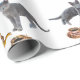 Zwei graue Kätzchen haben Tee mit Vintager China auf diesem altmodischen Verpackungspapier.