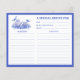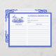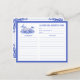 Diese Rezeptkarte hat ein monochromatisches Design mit einem blauen und weißen Chinoiserie Tee Set umgeben von Blume und Vögeln. Der Rücken hat eine koordinierende blaue Grenze.