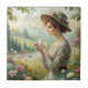 Eine Dame, die eine Tasse Tee im Blumengarten genießt