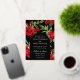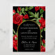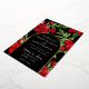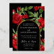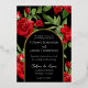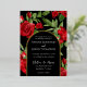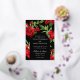Die Blumenarrangements stehen hinter den Details der Hochzeitszeremonie, die von einem Bogen für diese schöne Rote Blume-Einladung umgeben sind. Der Doppelbogen ist in realer Folie (Gold, Silber oder Rose). Die Rückseite der Einladung ist eine kleine Blumengestalt über dem Hochzeitstag in weißem Text auf schwarzem Hintergrund.