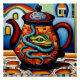 A.I. schuf einen surrealen Ausdruck eines Panda, der aus einem farbenfrohen Teekessel herausguckt, umgeben von einem lebendigen Mosaik geometrischer Formen, Mustern feiner Farben.