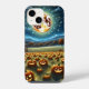 AI generierte Kunst einer spöttischen Halloween-Szene mit einem gigantischen, glühenden Mond über einem Kürbispflaster und einem Bauernhaus.