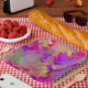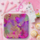 Teller aus rosa, lila und goldfarbenem Marmorpapier.