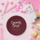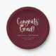 Glückwunsch Grad! Spielvolles weißes Drehbuch mit goldenem Graduiertenkappenakzent, Graduierungsparty Papier Teller. Features, bordeauxroter Hintergrund.