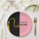 Creative Abschluss Glückwunschs Party Teller mit klassischen schwarz-goldenen Kappe auf einem rosa Hintergrund. Bearbeiten Sie Text, um den Namen des Grads hinzuzufügen.