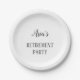 Diese minimalistische Papiertafel eignet sich perfekt für ein elegantes Ruhestandsalter oder einen eleganten Empfang. Das Design zeichnet sich durch dunkelgraue Kalligraphie mit kontrastierender einfacher Typografie aus. Sie können diese Party-Teller anpassen, indem Sie Hintergrund und Wortlaut in eine beliebige Farbe ändern oder eigene Grafiken und Grafiken hinzufügen. Personalisieren Sie die Teller mit dem Namen des Rentners.
