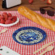 Papier Party Teller mit dem Bild von Vintagen nautischen Fisch-Design in den Farben Blau und Weiß.