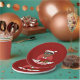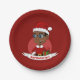 Papier Teller mit einer Illustration eines niedlich lächelnden glücklichen Jungen mit Brille, trägt er ein rot-weißes Weihnachtskostüm und hält ein Geschenk; mit bearbeitbaren Textvorlagen für Ihren Namen oder Ihre Nachricht, Weihnachtsfeiertagsgestaltung mit rotem Hintergrund