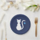 Ein Silhouette Cartoon einer weißen Katze mit blauen Augen auf einem marinösen Hintergrund. Ein blauer Stern windet sich vom Schwanz der Katze.