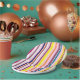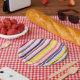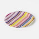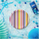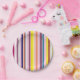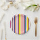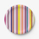 Gelbe, rosa, lila, blaue, grüne, weiße, senkrechte, sommerliche Stimmungsstreifen Streifen Papier Teller.