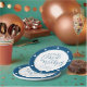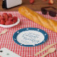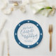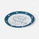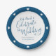 Einfache grafische blaue Schrift Text und weiße Herzen Hochzeitsarbeit Teller. Typografischer Text liest Essen, trinken & feiern die Hochzeit von dann fügen Sie Ihre eigenen Namen unter. Eine personalisierte Ergänzung zu Ihrem Hochzeitsbuffet oder Ihren Party-Tischen. Andere passende Elemente und Farben sind in diesem Design verfügbar. © Original design by Sarah Trett www.sarahtrett.com for www.mylittleedenweddings.com