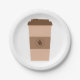 Eine Kaffeetasse mit einer Kaffeebohnendekoration darauf. Dieses Design wirkt auf diesen Paper-Tellern sehr effektiv