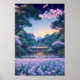 Ein atemberaubender Holztempel liegt am Rande eines üppig grünen Waldes, vor dem sich ein blühendes, violettes Blumenfeld befindet. Der Tempel strahlt ein Gefühl der Ruhe und der Ruhe aus und fügt sich nahtlos in seine natürliche Umgebung ein. Die Bäume rusteln sanft in der Brise, und der entfernte Klang eines brüchigen Baches ist zu hören.