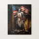 Eine Abbildung zeigt einen Templerritter in voller Rüstung, stehend stolz mit einer großen amerikanischen Fahne über seiner Schulter. Der Ritter ist in einer silbernen Rüstung mit weißer Tunika mit roten Kreuzen verkleidet. Er hält lange Mitarbeiter, an denen die amerikanische Fahne befestigt ist, und sein Helm ist geschlossen, was ihm einen stoischen und entschlossenen Ausdruck verleiht.
