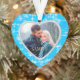 Dieses hübsche Urlaubssornament besticht durch Ihr eigenes Foto in einem strahlenden, herzförmigen Rahmen. Der Rahmen ist auf einem eisblauen Hintergrund mit weißen vier Sternen verlegt. Die Rückseite des Ornaments hat den gleichen Hintergrund und Rahmen, mit Ihrem benutzerdefinierten Text in blau auf einem soliden weißen Hintergrund. Hell und elegant!