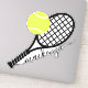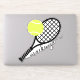 Personalisierter Name Contour Cut Sticker mit Tennis Racket und Ball Monogram in einem Girly, Feminine, Elegant Calligraphy Script Schriftart ist in verschiedenen Größen für Ihren Laptop, Wasserflasche, Aufkleber Sammlung oder als Favoriten und Geschenke für eine Tennis Geburtstagsparty erhältlich.