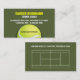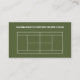 Ob es auf Gras, Lehm oder einem Hartplatz ist, wird das Spiel durch Millionen geliebt. Auf dieser Visitenkarte wird ein Tennisball weg auf der Unterseite der Karte auf einem grünen Hartplatz geerntet. Hauptkontaktinformationen drucken gegen den Hintergrund mit Netzinformationsdrucken auf dem Ball selbst. Die Rückseite zeigt ein Diagramm eines Tennisplatzes auf dem Hartplatz. Ein tagline oder andere Informationsdrucke oben. Vervollkommnen Sie für Tennistrainer, Teams, Tennisvereine, sportliche gute Speicher oder jeden möglichen Sporteinzelhändler. Verfügbar mit zusammenpassenden Produkten.
