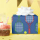 Es handelt sich um ein farbenprächtiges grafisches Muster aus roten und grünen Tennisschlägern und klassischen Tennisbällchen auf blauem Hintergrund, die einen harten Platz symbolisieren.