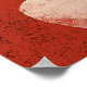 Abstrakt in Schwarz, Weiß und Rot. Eine große, kreisförmige Form geht von oben nach unten über einen rot-orangen Hintergrund. Gerade Linien kreuzen sich auf der großen Form, während 3 schwarze Akzente auf der rechten Seite verzieren und sich dann unten wiederholen.