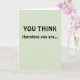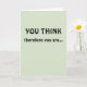 Feiern Sie eine große berufliche Leistung Ihres Kollegen, Freundes oder Liebes mit dieser Karte! Die Botschaft ist ein Stück auf dem Satz des Philosophen René Descartes "Je pense, donc je suis [Ich denke, daher bin ich]" ("cogito ergo sum"). Die Vorderseite der Karte lautet: "DU DENKST", gefolgt von "Darum bist du..." Öffnen Sie die Karte, die Formulierung wird fortgesetzt: "TENURED! Herzlichen Glückwunsch!" Die Vorderseite der Karte ist hellgrün, und die Meldung erscheint in schwarzer Schrift. Perfekt für jeden, der eine akademische Anstellung hat!