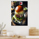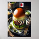 Erleben Sie Tokio mit diesem exquisiten japanischen Teriyaki Burger. Eine Premium Waggyu Rindfleischpartie, glasiert mit einer reichen und herzhaften Teriyaki-Sauce, wird mit einer delikaten Wespabi-Mayo, knusprigen, zerkleinerten Kohl, und alles eingebettet in eine weiche, geröstete Reismehlbun. Eine kleine japanische Fahne fügt eine elegante Touch hinzu, während die Chopsticks neben dem Teller die Erholung bilden und dieses kulinarische Meisterwerk ergänzen.