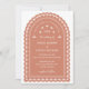 Wenn Sie von einer eleganten Hochzeit im Herbst träumen, ist diese Einladung für Sie. Diese romantische Bogen-Hochzeitseinladung besticht durch ein zartes Design, das an Blüten und flatternde Blätter erinnert. Es bietet durchdachte Touchs wie ein Monogramm mit den Initialen des Paares, eine wunderschöne Typografie und ein komplettes Design auf der Rückseite. Die Cotta-Terrafarbe schafft eine reiche, erdige Wärme, die die natürlichen Farben der Herbstsaison ergänzt.