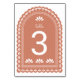 Diese romantische Tischnummer mit Arkaden erinnert an ein zartes Design, das an Blüten und flatternde Blätter erinnert. Ihre Hochzeitsgäste kommen an ihren Tisch, um dieses charmante Tafelschild zu sehen. Die Cotta-Terrakotta-Farbe schafft eine reiche, erdige Wärme und ist eine perfekte Ergänzung zu den natürlichen Farben der Herbstsaison. Eine schöne Ergänzung zu Ihrem mexikanischen oder südwestlichen Hochzeitsempfang.