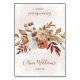 Lassen Sie Ihre Gäste mit Wärme und rustikaler Eleganz in diesem individuell gestaltbaren Platzkarte-Design führen, das sich perfekt für ein Herbstfest eignet. Dieses Design mit einer wunderschönen Anordnung von Aquarellfarben-Herbstlauben und Blüten in Rost, Orange und Terracotta-Tönen verleiht Ihrem Tisch eine Touch böhmischen Charmes. Die klare Typografie für Namen und Tischnummern sorgt für eine einfache Lesbarkeit, während das Design perfekt dazu geeignet ist, sich in eine stilvolle Zeltform einzuklappen, was die Dekoration Ihres Events mit einer erdigen, einladenden Ästhetik untermauert.