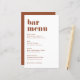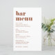 Fügen Sie diese individuell anpassbare Bar-Kartenauflösung zu Ihrem Event-Tablescape hinzu. Sie zeichnen sich durch fett formatierte Retrotypografie und einfache Terrakotta-Typografie aus. Diese Terracotta-Bar-Karte ist ideal für Hochzeiten, Brautpartys, Babyduschen und vieles mehr.