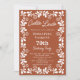 Terracotta Mexican Talavera Cielito Lindo 70. Geburtstagsfeier Einladung für Frauen - Feiern Sie ihren 70. Geburtstag stilvoll mit dieser schönen mexikanischen Kunst Talavera inspiriert Design für eine Frauenfeier 70. Geburtstag. Mit schöner und naturbrauner Terracotta Barockfarbe und weißer Farbpalette. Der Kalligraphietext und die typisch mexikanischen Pappel Picado Wirbel machen ihn zu einem einzigartigen, gemütlichen und festlichen 70. Geburtstag Meilenstein. Ideal für eine mexikanische Fiesta Geburtstagsfeier. Passen Sie diese bearbeitbare Party-Einladung zum 70. Geburtstag mit Ihren eigenen Veranstaltungsdetails an. Erhältlich zum Bestellen im druckbaren Format über Zazzle oder sofortigen digitalen Download, einfach per E-Mail, Text oder Social Media zu versenden.