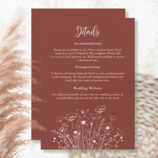 Diese Terrakotta- und weiße Umschließkarte bietet alle Details für Ihre Gäste. Die fett-weiße Schrift und die weißen Wildblumen schaffen ein elegantes Motto für Ihren Hochzeitstag. Alle Informationen können individuell angepasst werden und ein QR-Code auf der Rückseite steht Ihren Gästen zur Verfügung, um mehr Informationen auf Ihrer Website zu sehen