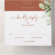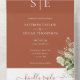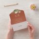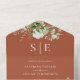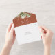 Diese schicke, blumengeschmückte Hochzeitseinladung kann mit Ihren Monogramm-Initialen und den Informationen über den Hochzeitstag auf Terrakotta-Hintergrund personalisiert werden. Die Einladung enthält eine perforierte RSVP-Karte, die für Sie individuell adressiert oder links als leere Karte für die Handschrift der Adressdaten Ihres Gastes verwendet werden kann. Entwickelt von Thisisnotme©