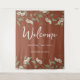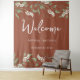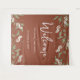 Dieses Design besticht durch eine Terrakotta-Vegetation mit einer einfachen blumengeschmückten Kulisse mit einem schicken Kalligraphie-Ampersand, botanischem Blattwerk, minimalistischem Design, einem weißen Blumengarten, einer Begrüßungssignatur, einem eleganten Dekor für die Hochzeitsfeier, einem klassischen Hochzeitsstil, einem einfachen Dekor für die Hochzeit. Rostfarbe.