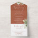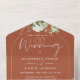 All dies in einer Terracotta Hochzeitseinladung mit botanischer Vegetation Blumengestalt, die über einen goldenen Bogen mit eleganter Kalligraphie-Schrift-Typografie fällt. Die Einladung enthält zusätzliche Gastdetails und eine perforierte RSVP-Karte, die für Sie individuell adressiert oder verlassen werden kann, damit Sie die Adressdaten Ihres Gastes handschreiben können. Entwickelt von Thisisnotme©