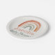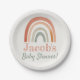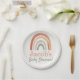 Set ein stilvolles Ambiente für Ihre Feier mit dieser schönen Babyduschplatte, die mit einem sanften, handgemalten Boho-Regenbogen in erdigen Pastelltönen über einer fröhlichen "Baby Shower!" und dem Namen des Babys besticht. Die warme, neutrale Farbgestaltung und der moderne, minimalistische Schriftart machen ihn zu einem idealen Ort für geschlechtsneutrale, rustikale oder zeitgenössische Themen. Dieses Design ist ein einladender Akzent für Ihren Party-Tisch und verbindet zeitlosen Charme mit schlichter Eleganz und sorgt für ein koordiniertes und unvergessliches Ambiente für jeden Gast.