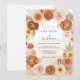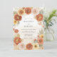This design features a warm palette of terracotta, burnt orange, and soft peach. Large ranunculus and sun-drenched sunflowers create a rich floral arrangement over a subtle sandy watercolor wash. A touch of desert flair is added with a small cactus and delicate eucalyptus leaves. The aesthetic evokes a spirited southwestern mood, perfect for an outdoor autumn event.