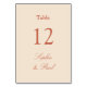 Terracotta Straw Beige Wedding Tischnummer mit eleganten traditionellen Stilschriften. Das Design kopiert sich automatisch auf die andere Seite der Karte, sodass beide Seiten identisch sind. Bitte ändern Sie den Namen des Paares und die Tischnummer in der Online-Personalisierungsvorlage entsprechend. Bitte fügen Sie den Warenkorb individuell für jede gewünschte Nummer hinzu (bitte editieren Sie die Nummer und die Namen jedes Mal).