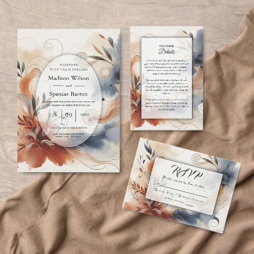 Set the tone for your wedding day with this bold and romantic invitation from the “Terracotta Twilight and Navy Blooms” collection. Featuring elegant watercolor swirls in warm terracotta and deep navy hues, this design is accented with flowing golden lines and graceful florals for a sophisticated, artistic touch. The rich, moody palette creates a stunning contrast that’s perfect for fall, modern, or boho-inspired weddings. Fully customizable with your wedding details, this invitation brings striking style and timeless elegance to your special celebration.