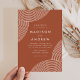 Moderne Einladungen mit cremefarbenen, kreisförmigen geometrischen Linien an den Ecken mit Terrakotta-Hintergrund. Personalisieren Sie die Terracotta Hochzeitseinladungen durch Hinzufügen Ihrer Namen und Hochzeitsdetails. Die modernen Hochzeitseinladungen kehren zu einem soliden Terrakotta-Hintergrund zurück.