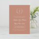 Terracotta Hochzeit Einladung. Diese elegante Hochzeitseinladung besticht durch ein weißes Wappen von Blätter mit dem Monogramm der Braut und des Bräutigams auf Terrakotta-Hintergrund. Der Text ist weiß und die Rückseite der Einladung ist Terrakotta. Dies ist Teil der Minimal Wappen & Blätter Kollektion.