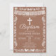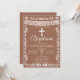 Elegante Terrakotta-Taufeinladung mit zarten weißen Papel-Picado-Banner-Details und ornamentalen Schnörkeln, die von traditioneller mexikanischer Dekoration inspiriert sind. Ein klassisches Kreuz oben fügt diesem kulturell inspirierten Design eine bedeutungsvolle und ehrfürchtige Note hinzu.