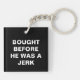 Das ist eine schwarz-weiße Schlüsselkette, die sagt: "Bekauft, bevor er ein Jerk war".