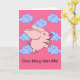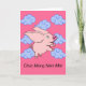 Tet, vietnamesisches neues Jahr, Chuc Mung Nam Moi, Papiergrußkarte. Ein niedliches Fliegenschwein mit den großen Ohren, der hellen rosa Schnauze und dem gelockten Schwanz wird auf der Abdeckung der Karte gekennzeichnet. Asiatische inspirierte auspicious Wolken in den Schatten von Blauem füllen den rosa Himmel aus. Kunst, Bild und Verscopyright © Shoaff Ballanger Studios.