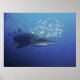 Der Strobe aus meiner Kamera beleuchtete die Fischschule über dem Kopf des teuflisch aussehenden Sandtiger-Hais. Trotz ihres Aussehens sind sie ziemlich harmlos