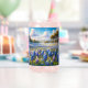 A dreamy expanse of Texas bluebonnets stretches across rolling hills, bathed in soft sunlight beneath a bright, cloud-dappled sky. The palette glows with vivid indigo, lavender, and creamy white blooms, set against golden-green grasses and scattered oak trees that frame the distance with grace. This enchanting landscape evokes a serene, pastoral mood—perfectly capturing the quiet magic of springtime in the countryside. Painted in a romantic, slightly impressionist style, the composition offers both depth and warmth, with gentle gradients of light and color that draw the viewer in. Ideal for those who adore wildflower fields, Southern charm, and nature’s soft grandeur. AI generated artwork.