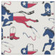 Texas-Flagge entworfen in ein Pferd, in Cowboyhut, in Cowboystiefel und in ein Seil zusammen benutzt auf diesem Stück. Das einzelne Pferd, die Stiefel, der Hut und das Seil sind auch auf unterschiedlichen Stücken Gewebe verfügbar. Dieser Entwurf ist auch auf anderen Einzelteilen im Rodeotagesspeicher verfügbar.