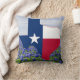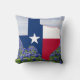 Texas-Staatsflagge in Form Texas mit einem Hintergrund von Bluebonnets und blauer Himmel drucken auf Throwkissen. Druck auf der Rückseite ist ein kleineres Wiederholungsmuster