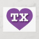 Diese Postkarte zeigt ein pulsierendes lila Herz mit den fett-, weiß-, Großbuchstaben TX, der offiziellen Abkürzung für Texas, den Lone Star Staat. Die Rückseite der Postkarte ist leer und wartet auf Ihren personalisierten Text oder Ihre handgeschriebenen Gefühle.