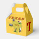Kontur Texas mit Ikonen in Bezug auf Texas,Vogel,Alamo,"Langornsteh",Blume,Gold auf Goldbasis