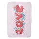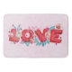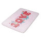 Eine Badematte mit Liebe in einem kühnen Schriftart im Blockstil, umgeben von Herzen und schönen Blume. Erschaffen mit Aquarellen. Hellrosa gemusterter Hintergrund.
